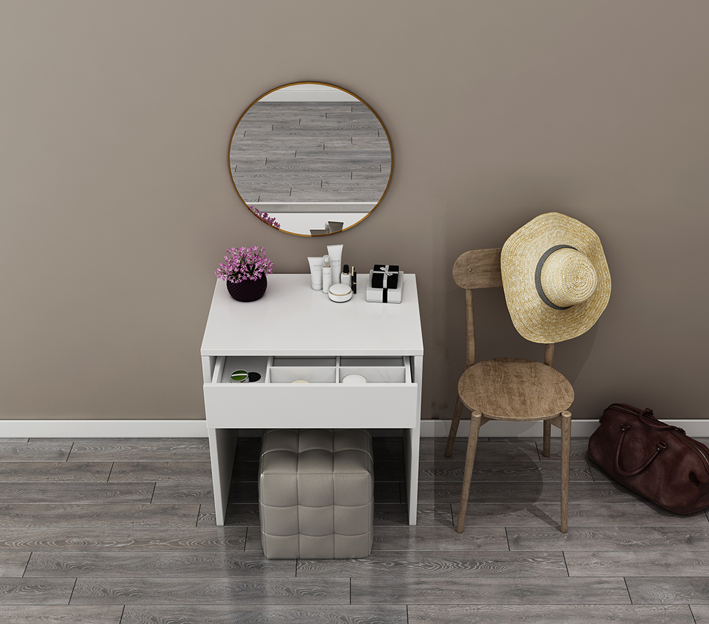 – Bàn phấn (bàn trang điểm) gỗ công nghiệp Ac, Sử dụng  Ván MDF chống ẩm cao cấp bề mặt phủ melamin hai mặt, liên kết ốc cam theo chuẩn module cabinet,  Phụ kiện được sử dụng kèm theo tủ của hãng Blumk. Đẫ bao gồm gương soi ThaiLand.
