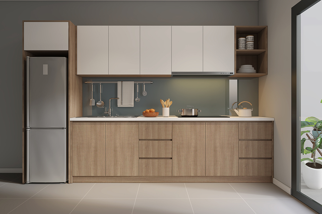 Tủ bếp hệ liên kết module cabinet cánh melamin An Cường mã màu trắng kết hợp vân gỗ vân gỗ, thùng ván MDF chống ẩm bề mặt phủ melamin hai mặt, phụ kiện Bulum. liên kết theo tiêu chuẩn châu âu, giấu liên kết. chống nước tại vị trí chậu rửa.